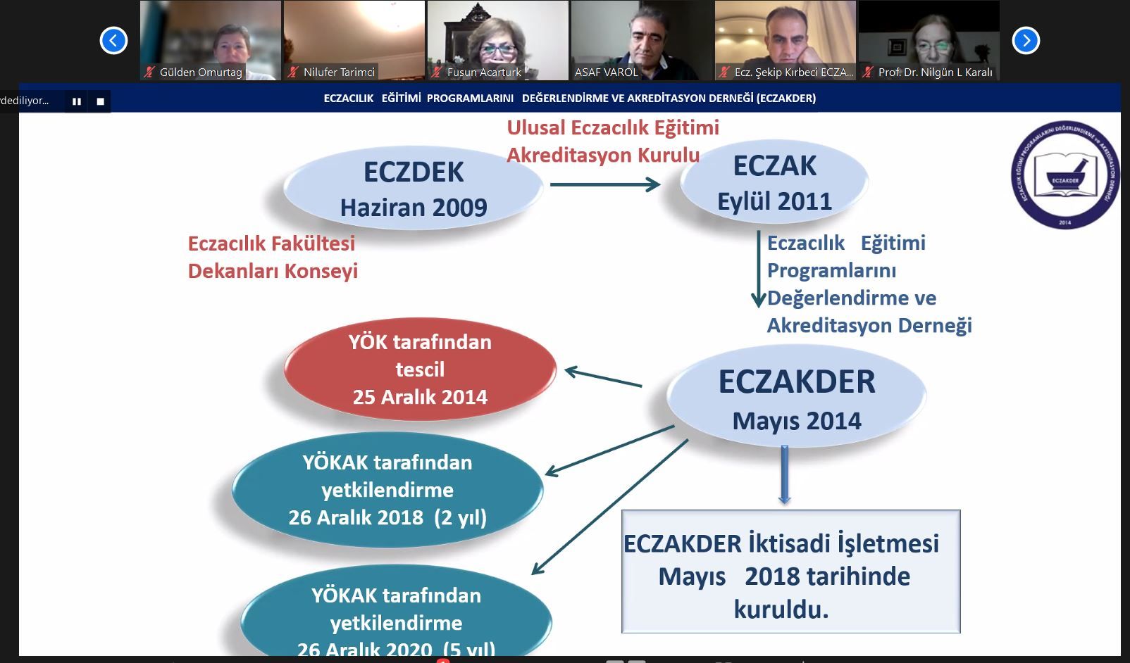Yükseköğretim Kalite Kurulu YÖKAK tarafından akreditasyon kuruluşlarına her yıl yapılan düzenli izleme ziyaretleri kapsamında 2022 yılı ECZAKDER faaliyetlerini değerlendirmek üzere YÖKAK İzleme Yetkilisi Prof. Dr. Asaf Varol tarafından 17.03.2023 tarihinde ECZAKDER ve ECZAK kurul ve komisyon üyelerinin hazır bulunduğu bir çevrim içi ziyaret gerçekleştirildi. Ziyaret toplantısı ECZAKDER Başkanı Prof. Dr. M. Seçkin Özden'in ECZAKDER faaliyetlerini detaylı olarak anlattığı sunumuyla başladı. Sayın Özden, sunumunda ECZAKDER ve ECZAK bünyesinde 2022 yılında yürütülen tüm faaliyetlerden, uluslararası işbirliği çalışmalarında, akreditasyon belge takdim törenlerinden, paydaşlar tarafından düzenlenen bilimsel etkinliklerde yer alan ECZAKDER temsiliyetinden bahsederek tüm kurul ve komisyonlarda ve ziyaret ekiplerinde görev alan üyelere, paydaşlara ve öğrencilere özel teşekkürlerini iletti. YÖKAK İzleme Yetkili Prof. Dr. Asaf Varol, Sayın Özden'in sunumunun ardından ECZAKDER bünyesinde yürütülen faaliyetleri, İngilizce web sayfasındaki gelişmeleri, uluslararasılaşma çabalarını takdir ettiğini belirterek geliştirilmeye açık bazı yönlerle ilgili değerli önerilerde bulundu. Bazı komisyonların işlerliğini daha yakından tanımak için toplantıdaki komisyon başkanlarına söz vererek süreçlerin tartışılmasına fırsat veren Sayın Varol, aynı zamanda İktisadi İşletme gelirlerinin artırılmasına yönelik değerlendirmelerde bulundu. Toplantıya ECZAKDER Başkanı ve tüm yönetim kurulu üyeleriyle birlikte ECZAK Başkanı Prof. Dr. Sedef Kır ve kurul üyeleri, komisyon başkanları ve üyeleri, öğrenci temsilcileri, ECZAKDER üyeleri, İktisadi İşletme Müdürü ve ECZAKDER Kurucu Başkanı ve Danışmanı Prof. Dr. Sevim Rollas'ın da bulunduğu 36 kişi katıldı.