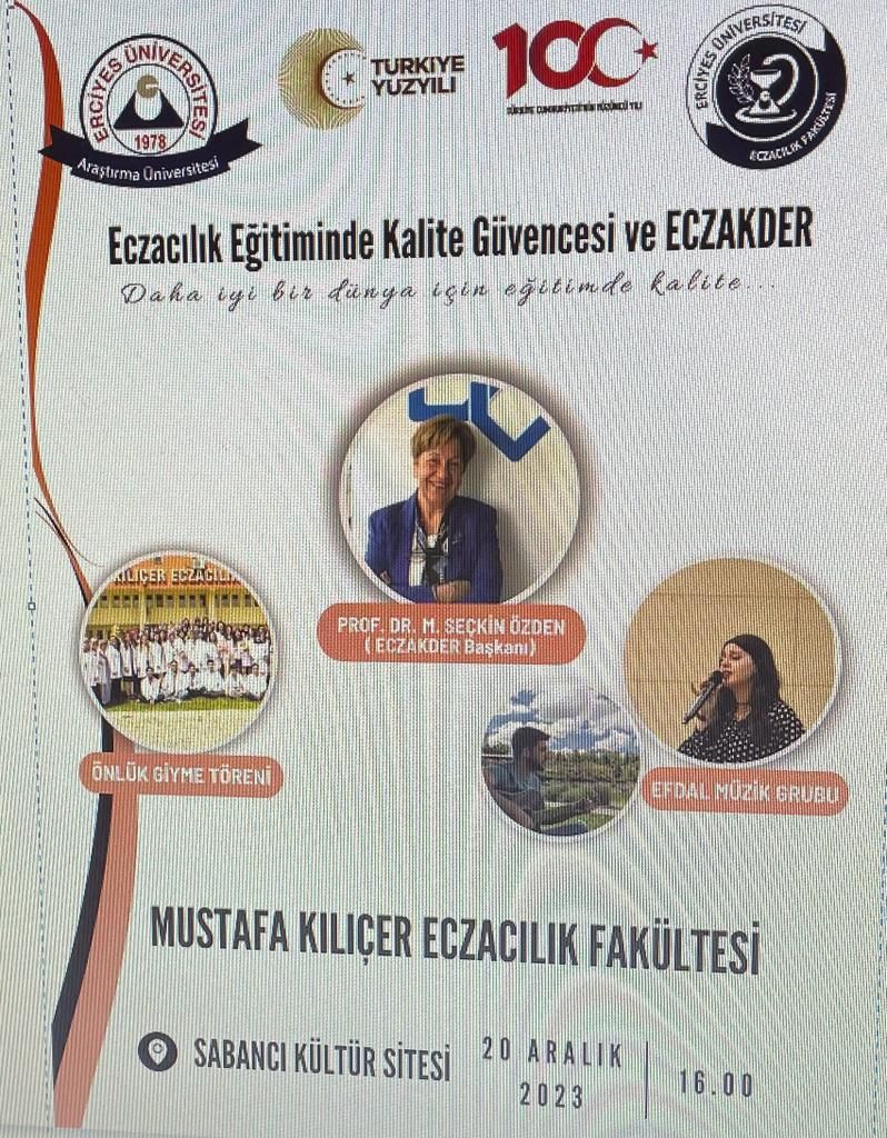 Erciyes Üniversitesi Eczacılık Fakültesi tarafından 20 Aralık 2023 tarihinde düzenlenen Beyaz Önlük Giyme törenine davet edilen ECZAKDER Başkanı Prof. Dr. M. Seçkin Özden eczacılık eğitiminde kalite güvencesini anlattığı sunumunda öğrencilere ECZAKDER'i ve akreditasyon sürecini tanıtma imkanı buldu.