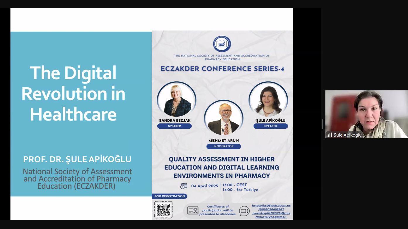 ECZAKDER konferans serisinin dördüncüsü 4 Nisan 2025 tarihinde çevrim içi olarak yapıldı. ECZAKDER Uluslararası Faaliyetler Çalışma Grubu tarafından düzenlenen "Quality Assessment in Higher Education and Digital Learning Enviroments in Pharmacy" konulu konferansın moderatörlüğünü Prof. Dr. Mehmet Arun üstlendi. Konferansın ilk konuşmacısı Hırvatistan Bilim ve Yüksek Öğretim Kurumu Uluslararası İlişkiler Başkanı Sandra Bezjak idi. Aynı zamanda Avrupa Kalite Güvencesi Kurumu üyesi olan sayın Bezjak konuşmasında Avrupa ve Hırvatistan'daki akreditasyon süreçlerinden ve kalite güvence mekanizmalarından söz etti. Konferansın ikinci konuşmacısı ECZAKDER Yönetim Kurulu Üyesi Prof. Dr. Şule Apikoğlu, konuşmasında sağlıkta dijital dönüşümden, bu alandaki uygulama örneklerinden ve faydalarından söz etti. Konferansı 50'ye yakın katılımcı takip etti.