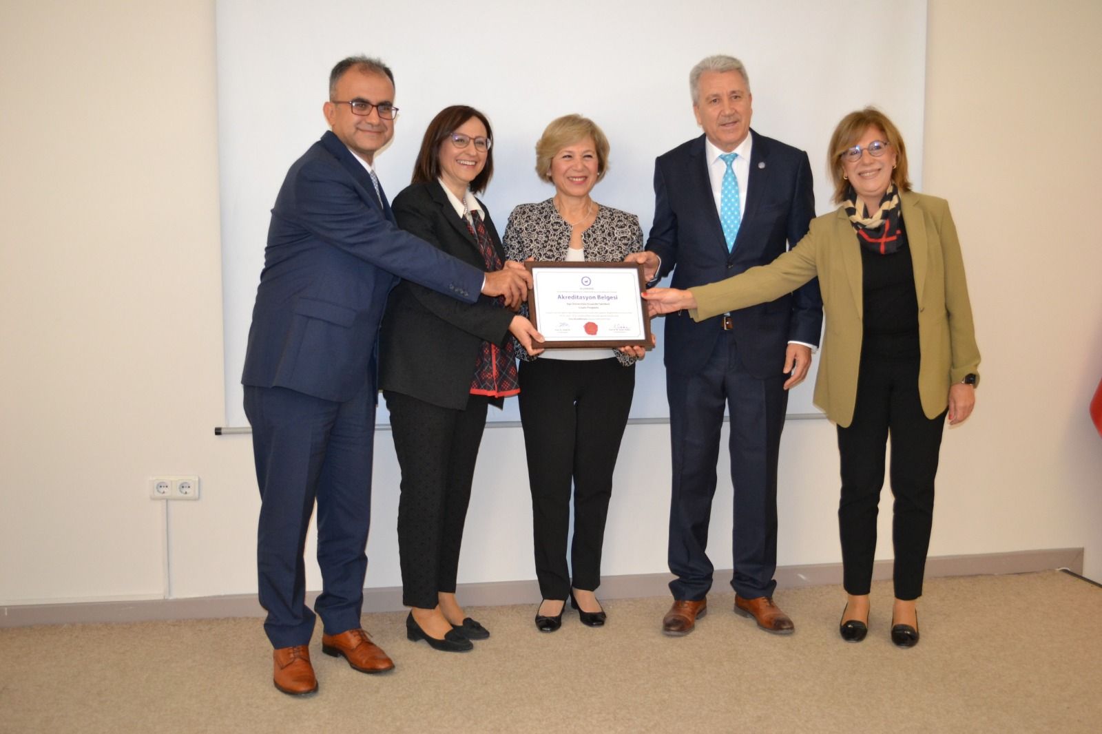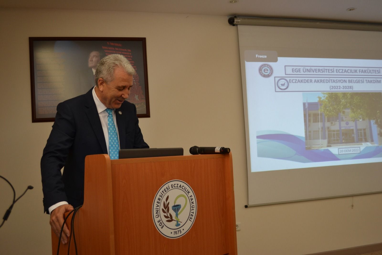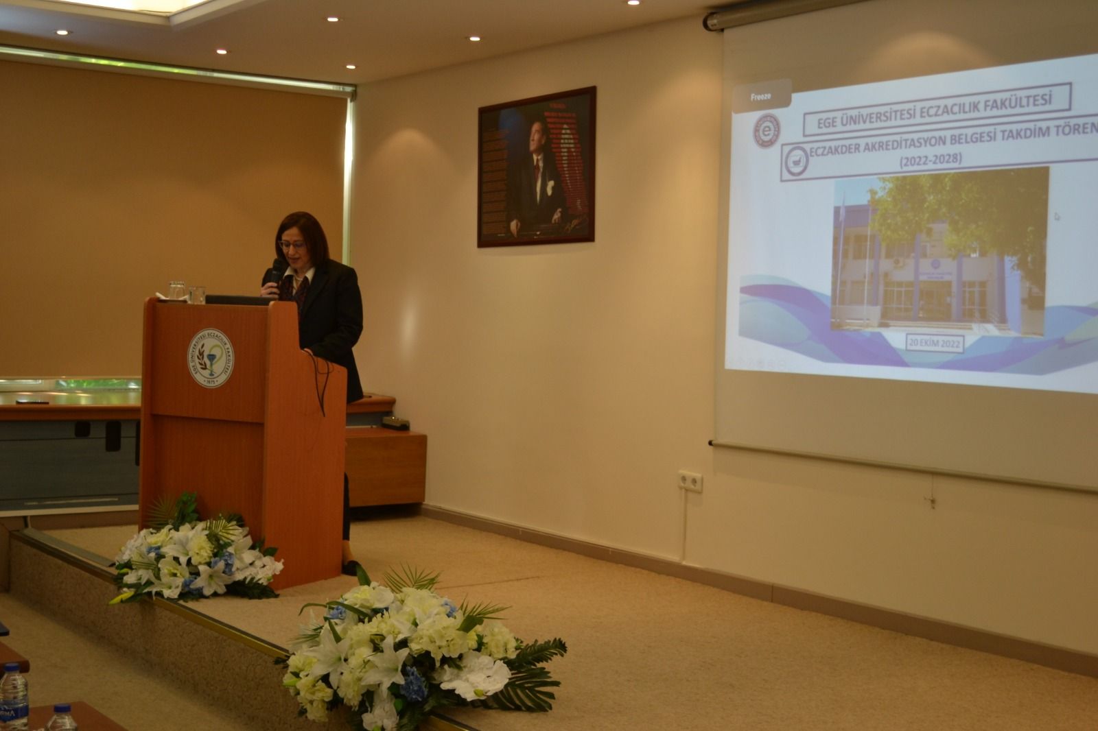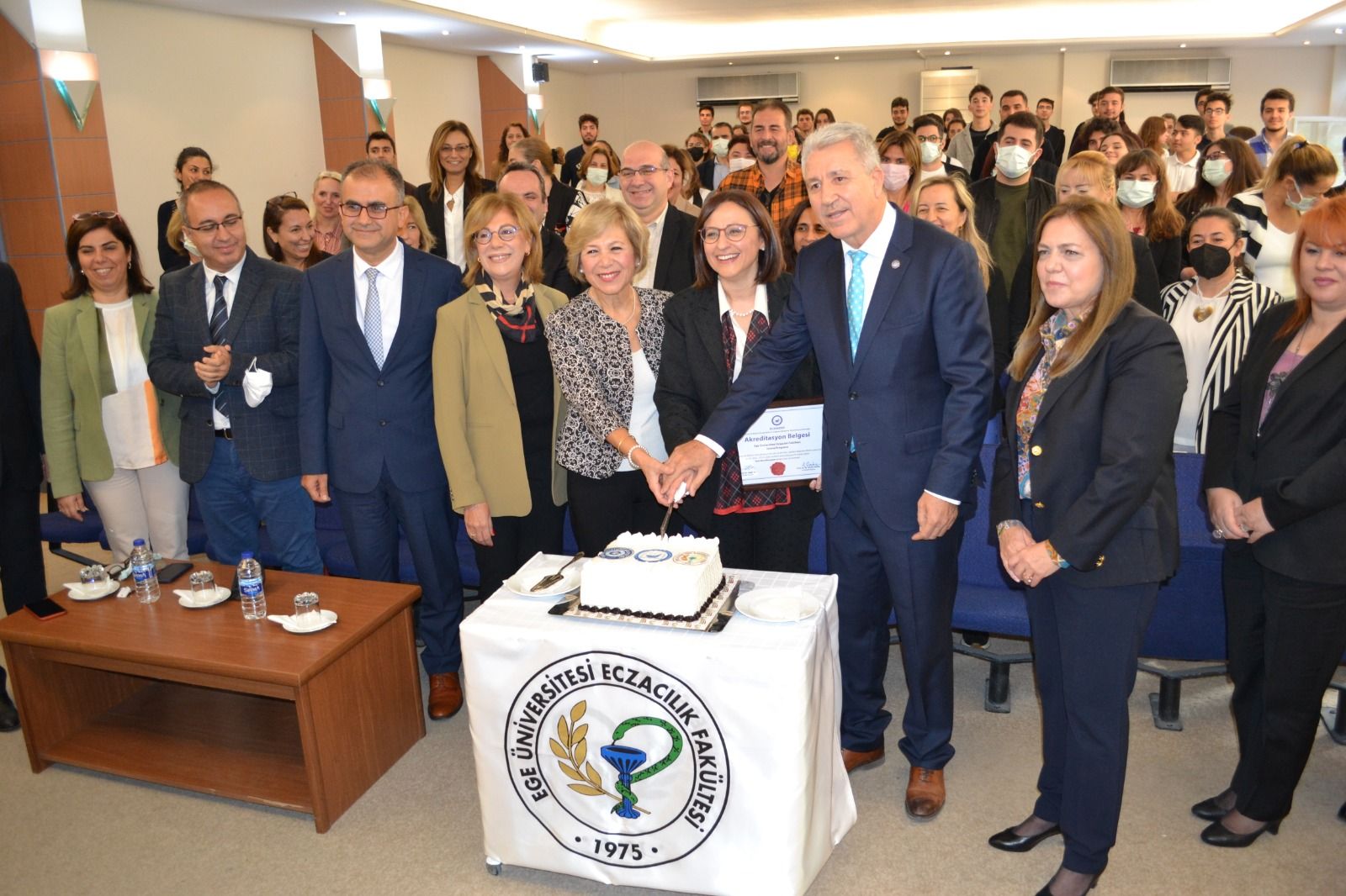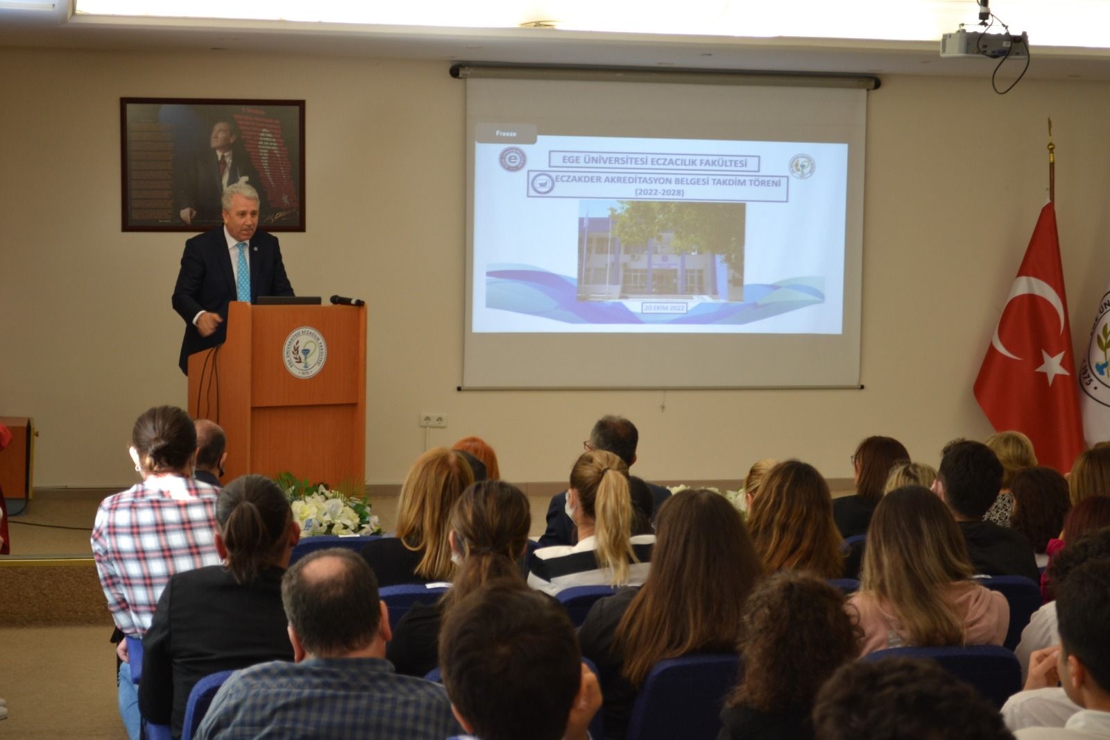 ECZAKDER tarafından 2022-2028 yılları arasında yeniden akredite edilen Ege Üniversitesi Eczacılık Fakültesine akreditasyon belgesi 20 Ekim 2022 tarihinde yapılan törenle verildi. Ege Üniversitesi Eczacılık Fakültesi Konferans Salonunda gerçekleştirilen törende akreditasyon belgesi ECZAKDER Yönetim Kurulu Üyeleri Prof. Dr. Füsun Acartürk ve Ecz. Şekip Kırbeci ile ECZAK Başkan Yardımcısı Prof. Dr. Aysun Pabuçcuoğlu tarafından Dekan Prof. Dr. Hande Gürer Orhan ve Rektör Prof. Dr. Necdet Budak'a takdim edildi. Törende ECZAKDER Yönetim Kurulu Üyesi Prof. Dr. Füsun Acartürk akreditasyon sürecinin önemini ve bu alanda yürütülen faaliyetleri özetleyen bir sunum gerçekleştirdi. Tören akademisyenler ve öğrencilerin de katılımıyla pasta kesiminin ardından sona erdi.