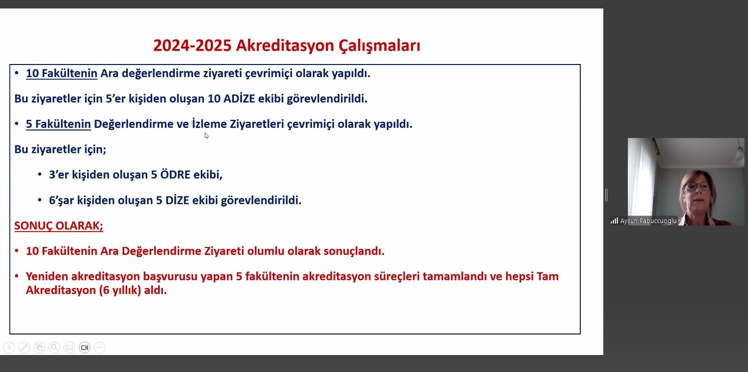 2024-2025 dönemi akreditasyon süreçlerinin değerlendirildiği çevrim içi toplantı 20'ye yakın üyenin katılımıyla 19 Haziran 2025 tarihinde gerçekleştirildi. Toplantı ECZAKDER Başkanı Prof. Dr. M. Seçkin Özden'in teşekkür konuşmasıyla başladı. Toplantının amacından ve YÖKAK tescil belgesi başvurusu için yapılmakta olan hazırlıklardan bahseden Özden sözü Uluslararası Faaliyetleri Geliştirme Çalışma Grubu Başkanı Prof. Dr. Sibel Süzen'e bıraktı. Prof. Süzen 13-14 Haziran 2025 tarihlerinde Talin'de gerçekletirilen ve ECZAK Başkanı Prof. Dr. Aysun Pabuçcuoğlu'yla birlikte katıldıkları CEENQA genel kurul toplantısından izlenimleri aktardı ve CEENQA üyesi olan ECZAKDER ile diğer akreditasyon ajanları arasında uluslararasılaşma konusunda geliştirilen işbirliklerinden söz etti.