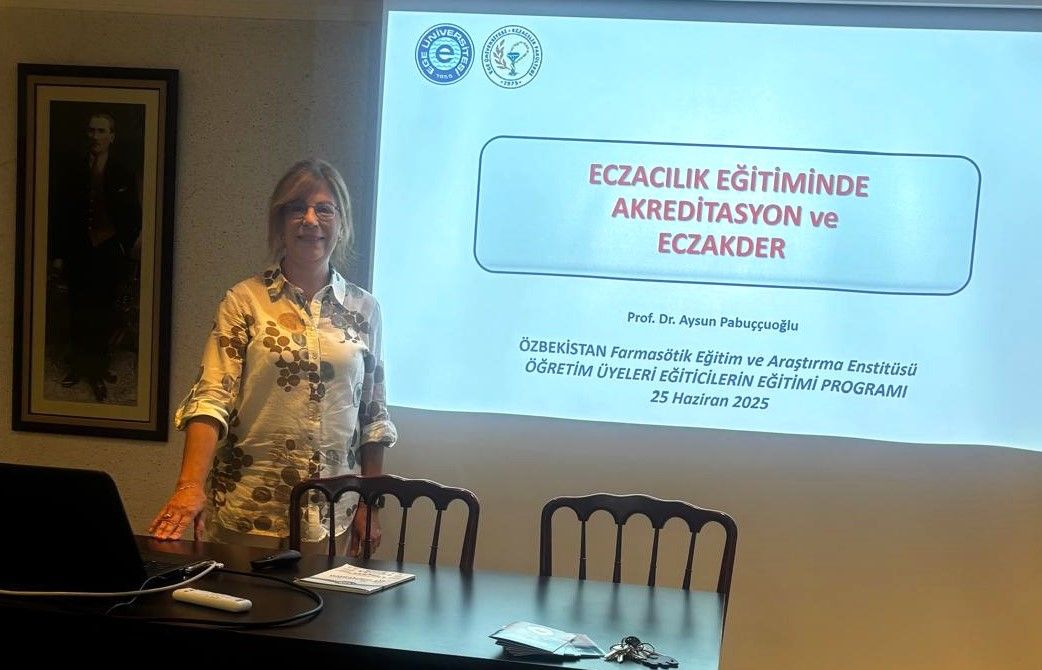 Ege Üniversitesi Eczacılık Fakültesi tarafından Özbekistan Farmasötik Eğitim ve Araştırma Enstitüsü öğretim üyelerine yönelik düzenlenen “EĞİTİCİLERİN EĞİTİMİ PROGRAMI” kapsamında 25 Haziran 2025 tarihinde ECZAK Başkanı ve aynı zamanda Ege Üniversitesi Eczacılık Fakültesi öğretim üyesi olan Prof. Dr. Aysun Pabuççuoğlu tarafından “Eczacılık Eğitiminde Akreditasyon ve ECZAKDER” konulu bir sunum yapılarak ECZAKDER tanıtıldı.