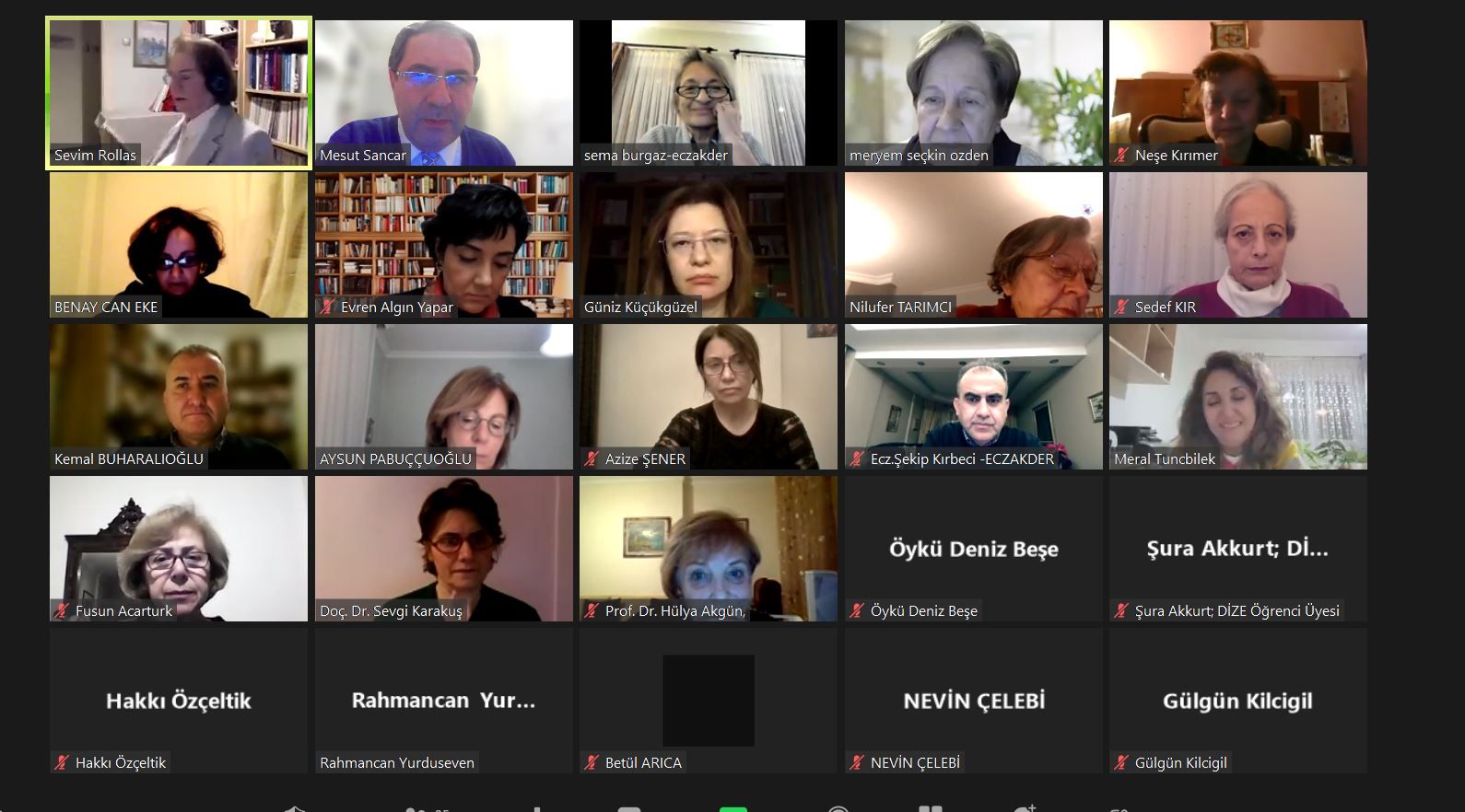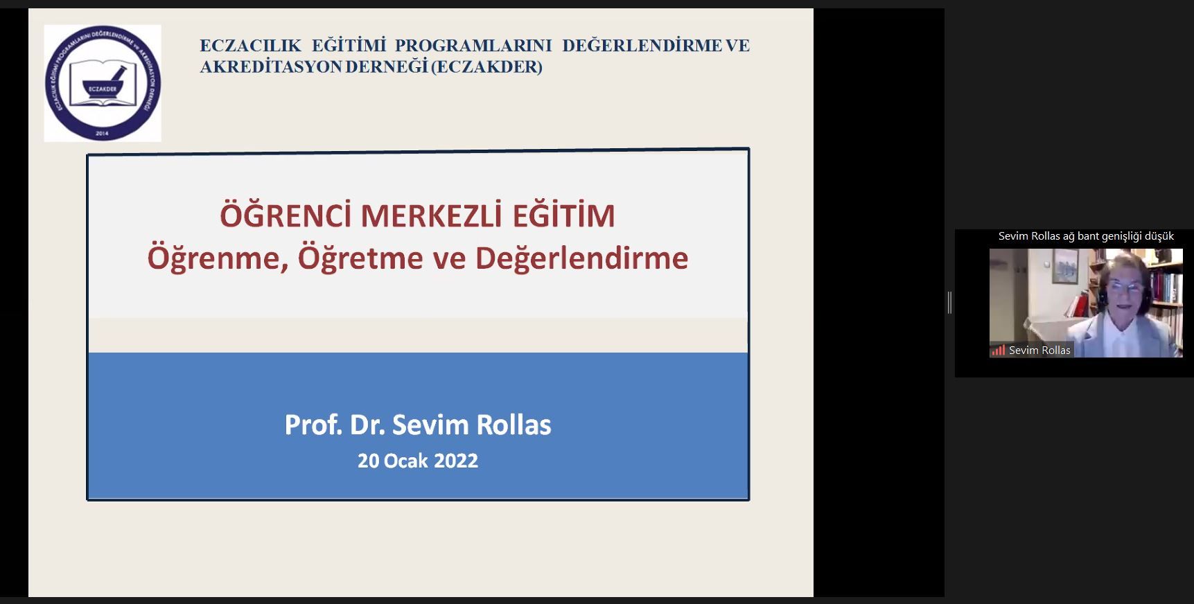 ECZAK ve ECZAKDER kurucu başkanı ve şu an ECZAKDER Danışmanı Prof. Dr. Sevim Rollas 20 Ocak 2022 günü tüm ECZAK ve ECZAKDER kurul üyeleri ve değerlendirici eczacı ve öğrencilerin katıldığı çevrim içi toplantıda yaklaşık 1.5 saat süren bir konferans verdi. Öğrenci Merkezli Eğitim konulu sunumunda Sayın Rollas başarılı bir eğitim modeli için öğrenme, öğretme ve değerlendirme yöntemlerine dair dünyadan güncel örnekler ve öneriler paylaştı. Sunumun ardından ECZAKDER Başkanı Prof. Dr. M. Seçkin Özden moderatörlüğünde katılımcıların soru ve katkılarıyla Türkiye'deki eğitim-öğretim sistemine yönelik değerlendirmeler de yapıldı.