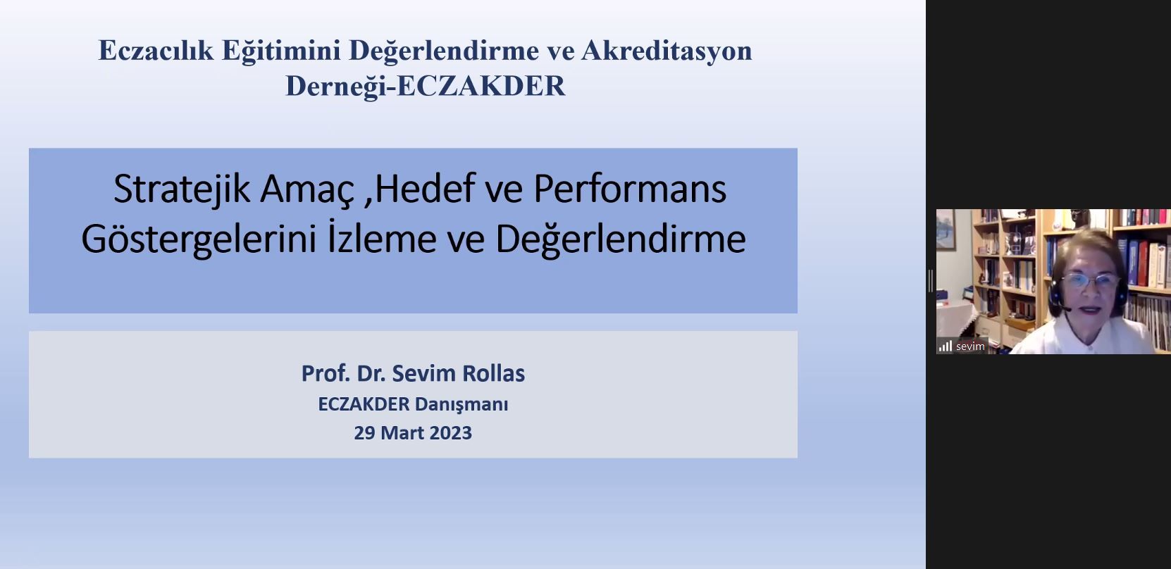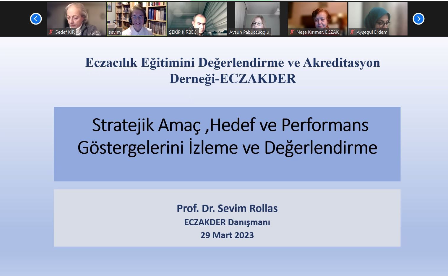 ECZAKDER Danışmanı Prof. Dr. Sevim Rollas tarafından 29 Mart 2023 tarihinde ECZAKDER ve ECZAK üyelerine yönelik "Stratejik Amaç, Hedef ve Performans Göstergelerini İzleme ve Değerlendirme" konulu bir geri bildirim semineri verildi.