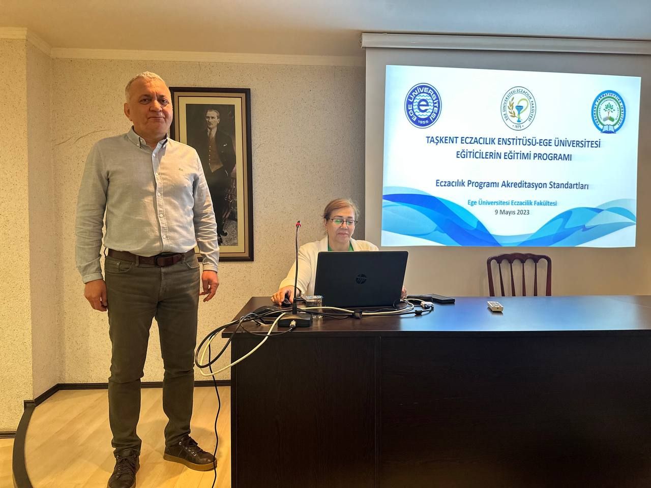 Ege Üniversitesi ile Taşkent Eczacılık Enstitüsü ikili işbirliği kapsamında "Eğiticilerin Eğitimi" adıyla E.Ü. Eczacılık Fakültesi Dekanı Prof. Dr. Hande Gürer Orhan tarafından 8-9 Mayıs 2023 tarihlerinde düzenlenen etkinlikte Taşkent Eczacılık Enstitüsü'nden ülkemize gelen 20 akademisyene Ege Üniversitesi Eczacılık Fakültesi'nde Prof. Dr. Aysun Pabuççuoğlu "Eczacılık Eğitiminde Akreditasyon ve ECZAKDER" başlıklı sunumu ile derneğimizi tanıttı. Prof. Dr. Hüseyin Taşlı ise "Eczacılık Eğitiminde Akreditasyon Standartları" başlıklı sunumuyla ECZAKDER akreditasyon standartları hakkında bilgiler verdi.