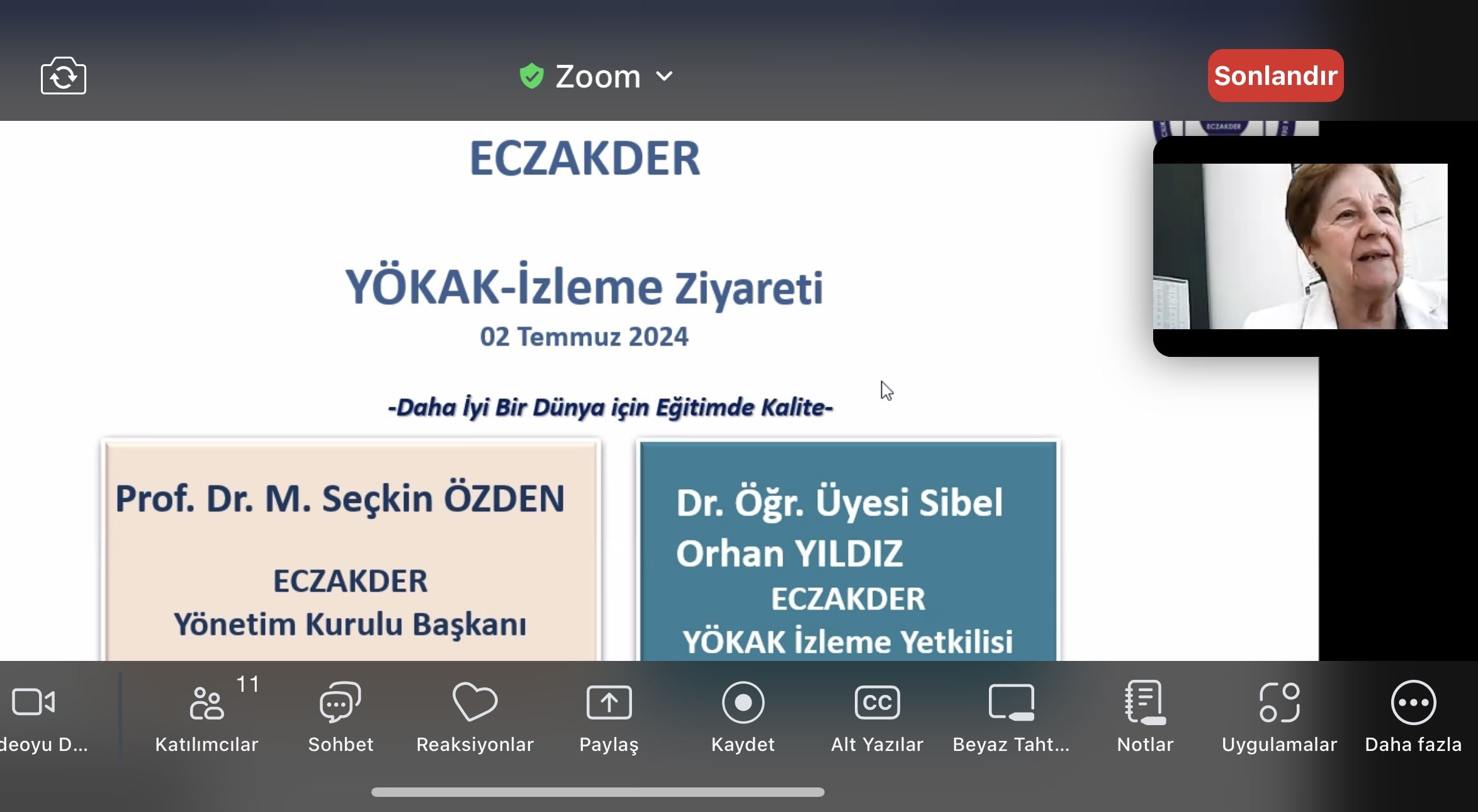 YÖKAK tarafından, Dış Değerlendirme ve Akreditasyon Kuruluşlarının Yetkilendirilmesi, Tanınması ve İzlenmesine İlişkin Kılavuz kapsamında görevlendirilen Dr. Öğr. Üyesi Sibel Orhan YILDIZ, ECZAKDER İzleme Yetkilisi olarak 2023 yılı faaliyetlerini değerlendirmek üzere ECZAKDER YK ile ECZAK'a bağlı komisyon, komite, çalışma grupları ve idari personelle bir program dahilinde 2 Temmuz 2024 tarihinde çevrim içi görüşmelerde bulunarak ziyareti tamamladı. İzleme ziyareti saat 10.00'da ECZAKDER Başkanı Prof. Dr. M. Seçkin Özden'in sunumu ile başladı, yönetim kuruluyla yapılan görüşmeden sonra ECZAK Üyeleri ve program kapsamındaki tüm komisyon üyeleri, çalışma grupları, değerlendirici eczacı ve öğrencilerle görüşme gerçekleştiren Dr. Sibel Orhan Yıldız, saat 14.30'da Yönetim Kurulu ile son kez görüşerek izleme ziyaretini sonlandırdı. .