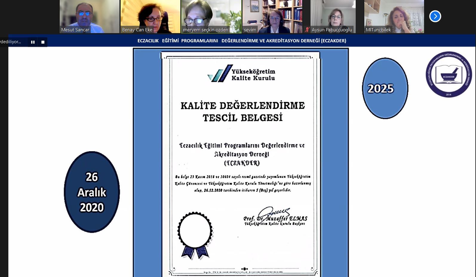 Yükseköğretim Kalite Kurulu YÖKAK tarafından akreditasyon kuruluşlarına her yıl yapılan düzenli izleme ziyaretleri kapsamında 2022 yılı ECZAKDER faaliyetlerini değerlendirmek üzere YÖKAK İzleme Yetkilisi Prof. Dr. Asaf Varol tarafından 17.03.2023 tarihinde ECZAKDER ve ECZAK kurul ve komisyon üyelerinin hazır bulunduğu bir çevrim içi ziyaret gerçekleştirildi. Ziyaret toplantısı ECZAKDER Başkanı Prof. Dr. M. Seçkin Özden'in ECZAKDER faaliyetlerini detaylı olarak anlattığı sunumuyla başladı. Sayın Özden, sunumunda ECZAKDER ve ECZAK bünyesinde 2022 yılında yürütülen tüm faaliyetlerden, uluslararası işbirliği çalışmalarında, akreditasyon belge takdim törenlerinden, paydaşlar tarafından düzenlenen bilimsel etkinliklerde yer alan ECZAKDER temsiliyetinden bahsederek tüm kurul ve komisyonlarda ve ziyaret ekiplerinde görev alan üyelere, paydaşlara ve öğrencilere özel teşekkürlerini iletti. YÖKAK İzleme Yetkili Prof. Dr. Asaf Varol, Sayın Özden'in sunumunun ardından ECZAKDER bünyesinde yürütülen faaliyetleri, İngilizce web sayfasındaki gelişmeleri, uluslararasılaşma çabalarını takdir ettiğini belirterek geliştirilmeye açık bazı yönlerle ilgili değerli önerilerde bulundu. Bazı komisyonların işlerliğini daha yakından tanımak için toplantıdaki komisyon başkanlarına söz vererek süreçlerin tartışılmasına fırsat veren Sayın Varol, aynı zamanda İktisadi İşletme gelirlerinin artırılmasına yönelik değerlendirmelerde bulundu. Toplantıya ECZAKDER Başkanı ve tüm yönetim kurulu üyeleriyle birlikte ECZAK Başkanı Prof. Dr. Sedef Kır ve kurul üyeleri, komisyon başkanları ve üyeleri, öğrenci temsilcileri, ECZAKDER üyeleri, İktisadi İşletme Müdürü ve ECZAKDER Kurucu Başkanı ve Danışmanı Prof. Dr. Sevim Rollas'ın da bulunduğu 36 kişi katıldı.