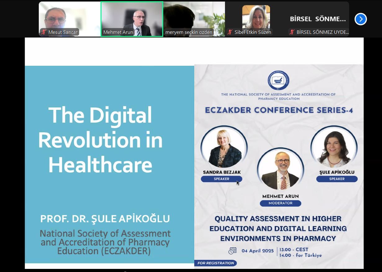 ECZAKDER konferans serisinin dördüncüsü 4 Nisan 2025 tarihinde çevrim içi olarak yapıldı. ECZAKDER Uluslararası Faaliyetler Çalışma Grubu tarafından düzenlenen "Quality Assessment in Higher Education and Digital Learning Enviroments in Pharmacy" konulu konferansın moderatörlüğünü Prof. Dr. Mehmet Arun üstlendi. Konferansın ilk konuşmacısı Hırvatistan Bilim ve Yüksek Öğretim Kurumu Uluslararası İlişkiler Başkanı Sandra Bezjak idi. Aynı zamanda Avrupa Kalite Güvencesi Kurumu üyesi olan sayın Bezjak konuşmasında Avrupa ve Hırvatistan'daki akreditasyon süreçlerinden ve kalite güvence mekanizmalarından söz etti. Konferansın ikinci konuşmacısı ECZAKDER Yönetim Kurulu Üyesi Prof. Dr. Şule Apikoğlu, konuşmasında sağlıkta dijital dönüşümden, bu alandaki uygulama örneklerinden ve faydalarından söz etti. Konferansı 50'ye yakın katılımcı takip etti.
