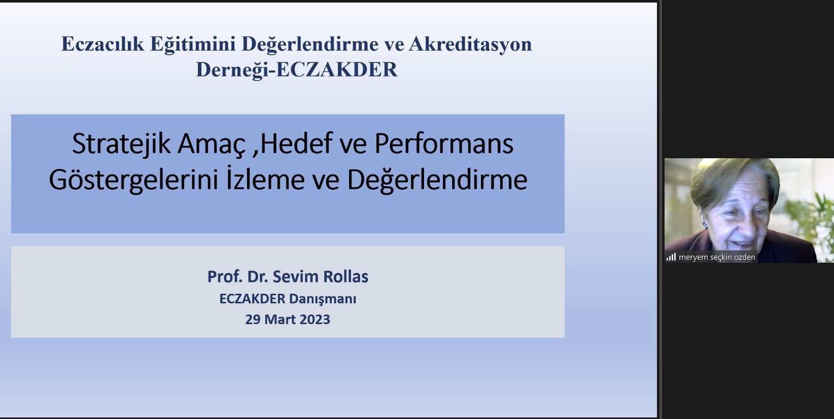 ECZAKDER Danışmanı Prof. Dr. Sevim Rollas tarafından 29 Mart 2023 tarihinde ECZAKDER Yönetim Kurulu Üyeleri, ECZAK Kurul ve Komisyon Üyelerine yönelik "Stratejik Amaç, Hedef ve Performans Göstergelerini İzleme ve Değerlendirme" konulu bir geri bildirim semineri verildi. YÖKAK İzleme Yetkili Prof. Dr. Asaf Varol tarafından gerçekleştirilen izleme ziyaretinde ele alınan bazı konu başlıklarına yönelik genel bir değerlendirmede bulunan Sayın Roolas'ın sunumuna buradan ulaşabilirsiniz.