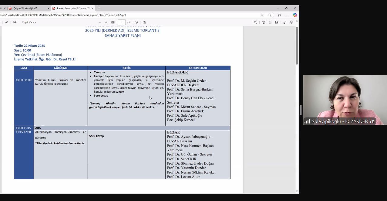 YÖKAK tarafından, Dış Değerlendirme ve Akreditasyon Kuruluşlarının Yetkilendirilmesi, Tanınması ve İzlenmesine İlişkin Kılavuz kapsamında görevlendirilen Dr. Resul TELLİ, ECZAKDER İzleme Yetkilisi olarak 2024 yılı faaliyetlerini değerlendirmek üzere ECZAKDER YK ile ECZAK'a bağlı komisyon, komite, çalışma grupları ve idari personelle bir program dahilinde 22 Nisan 2025 tarihinde çevrim içi görüşmelerde bulunarak ziyareti tamamladı. İzleme ziyareti saat 10.00'da ECZAKDER Başkanı Prof. Dr. M. Seçkin Özden'in sunumu ile başladı. Ziyaret, yönetim kuruluyla yapılan görüşmeden sonra ECZAK Üyeleri ile yapılan görüşme ile devam etti. Öğleden sonraki bölümde program kapsamındaki tüm komisyon üyeleri ve çalışma gruplarıyla yapılan toplantının ardından değerlendirici ekiplerinde yer alan üyeler, eczacılar ve öğrencilerle bir görüşme gerçekleştiren Dr. Resul TELLİ, günün sonunda ECZAKDER Başkanı Prof. Dr. M. Seçkin ÖZDEN ile son kez görüşerek izleme ziyaretini sonlandırdı.